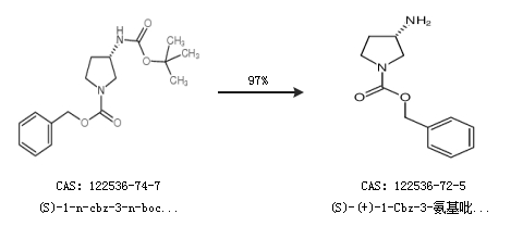 1.通過(S)-1-n-cbz-3-n-boc-氨基吡咯烷合成(S)-(+)-1-Cbz-3-氨基吡咯烷,收率約97%;
