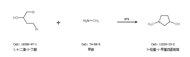 2.通過1,4-二溴-2-丁醇和甲胺合成3-羥基-1-甲基四氫吡咯,收率約97%;