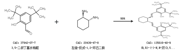 1.通過(guò)3,5-二叔丁基水楊醛和左旋-反式-1,2-環(huán)己二胺合成(R,R)-(-)-N,N-雙(3,5-二叔丁亞水楊基)-1,2-環(huán)己烷,收率約99%;