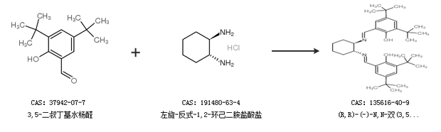 中文別名 (R,R)-(-)-N,N’-雙(3,5-二叔丁基亞水楊基)-1,2-環(huán)己二胺;(R,R)-(﹠#8722﹔)-N,N''-雙(3,5-二叔丁基亞水楊基)-1,2-環(huán)已二胺;(R,R)-(?)-N,N''-雙(3,5-二叔丁基亞水楊基)-1,2-環(huán)已二胺;(R,R)-雅可布遜配體;(R,R)-(-)-N,N''-雙(3,5-二叔丁基亞水楊基)-1,2-環(huán)已二胺;(R,R)-Jacobsen配體;(R,R)-(-)-N,N''-雙(3,5-二叔丁基亞水楊基)-1,2-環(huán)己烷二胺;
