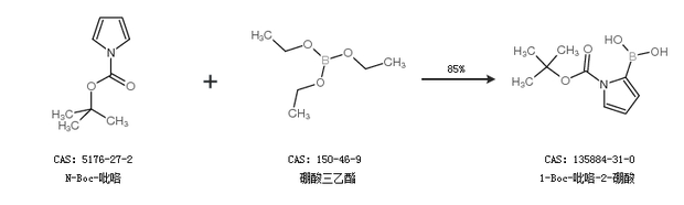 2.通過N-Boc-吡咯和硼酸三乙酯合成1-Boc-吡咯-2-硼酸,收率約85%;