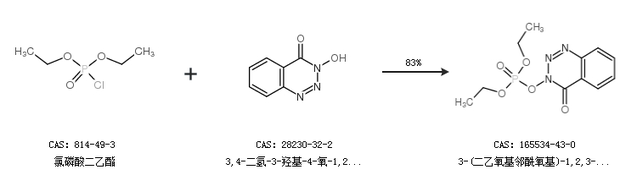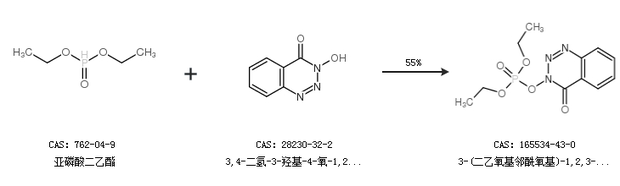 1.通過氯磷酸二乙酯和3,4-二氫-3-羥基-4-氧-1,2,3-苯并三嗪合成3-(二乙氧基鄰酰氧基)-1,2,3-苯并三嗪-4-酮,收率約83%;