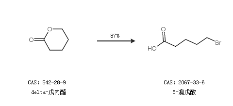 1.通過(guò)delta-戊內(nèi)酯合成5-溴戊酸,收率約87%;