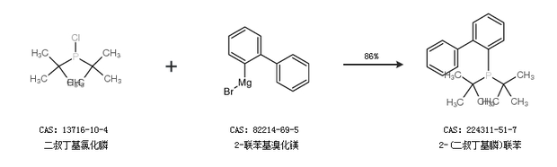 1.通過二叔丁基氯化膦和2-聯(lián)苯基溴化鎂合成2-(二叔丁基膦)聯(lián)苯,收率約86%;