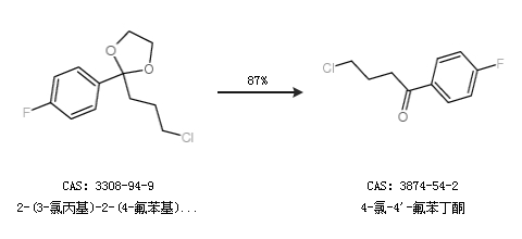 1.通過2-(3-氯丙基)-2-(4-氟苯基)-1,3-二氧戊烷合成4-氯-4''-氟苯丁酮,收率約87%;