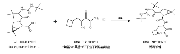 2.通過(guò)(1R,2S,5S)-3-[(2S)-2-[[[(叔丁基)氨基]羰基]氨基]-3,3-二甲基-1-氧代丁基]-6,6-二甲基-3-氮雜雙環(huán)[3.1.0]己烷-2-羧酸和2-羰基-3-氨基-4環(huán)丁烷丁酰胺鹽酸鹽合成博賽潑維,收率約90%;
