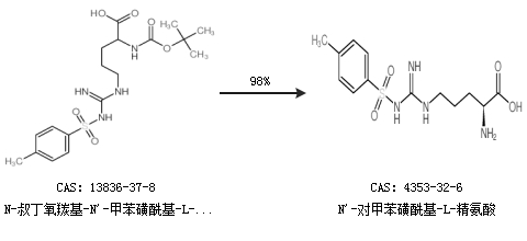 1.通過N-叔丁氧羰基-N''-甲苯磺?;?L-精氨酸合成N''-對(duì)甲苯磺酰基-L-精氨酸,收率約98%;
