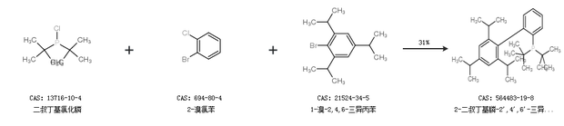 1.通過二叔丁基氯化膦、2-溴氯苯和1-溴-2,4,6-三異丙苯合成2-二叔丁基膦-2'',4'',6''-三異丙基聯(lián)苯,收率約31%;