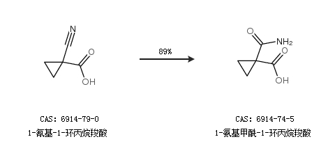 1.通過(guò)1-氰基-1-環(huán)丙烷羧酸合成1-氨基甲酰-1-環(huán)丙烷羧酸,收率約89%;