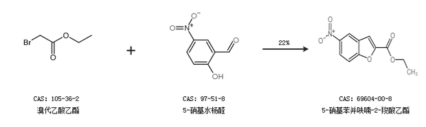 2.通過溴代乙酸乙酯和5-硝基水楊醛合成5-硝基苯并呋喃-2-羧酸乙酯,收率約22%;
