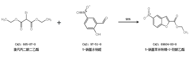 1.通過溴代丙二酸二乙酯和5-硝基水楊醛合成5-硝基苯并呋喃-2-羧酸乙酯,收率約98%;