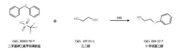 1.通過二苯基碘三氟甲烷磺酸鹽和乙二醇合成2-苯硫基乙醇,收率約84%;