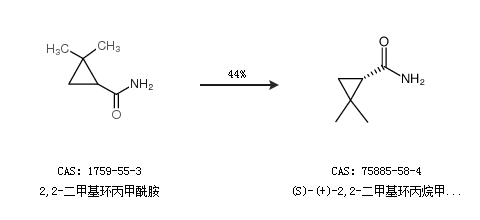 2.通過(guò)2,2-二甲基環(huán)丙甲酰胺合成(S)-(+)-2,2-二甲基環(huán)丙烷甲酰胺,收率約44%;