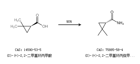 1.通過(guò)(S)-(+)-2,2-二甲基環(huán)丙甲酸合成(S)-(+)-2,2-二甲基環(huán)丙烷甲酰胺,收率約90%;
