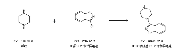 1.通過哌嗪和3-氯-1,2-苯代異噻唑合成3-(1-哌嗪基)-1,2-苯并異噻唑,收率約68%;