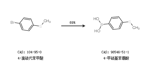 1.通過(guò)4-溴硫代苯甲醚合成4-甲硫基苯硼酸,收率約69%;