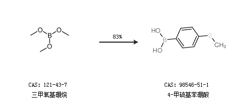 2.通過(guò)三甲氧基硼烷合成4-甲硫基苯硼酸,收率約83%;