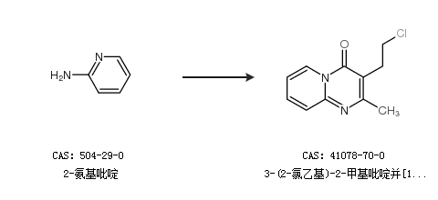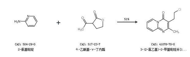 1.通過(guò)2-氨基吡啶和α-乙酰基-γ-丁內(nèi)酯合成3-(2-氯乙基)-2-甲基吡啶并[1,2-a]嘧啶-4-酮,收率約51%;