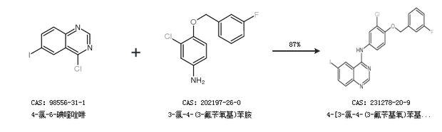 1.通過4-氯-6-碘喹唑啉和3-氯-4-(3-氟芐氧基)苯胺合成4-[3-氯-4-(3-氟芐基氧)苯基氨基]-6-碘喹唑啉,收率約87%;