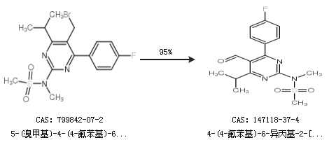 1.通過5-(溴甲基)-4-(4-氟苯基)-6-異丙基-2-[甲基(甲磺酰)氨基]嘧啶合成4-(4-氟苯基)-6-異丙基-2-[(N-甲基-N-甲磺酰)氨基]嘧啶-5-甲醛,收率約95%;