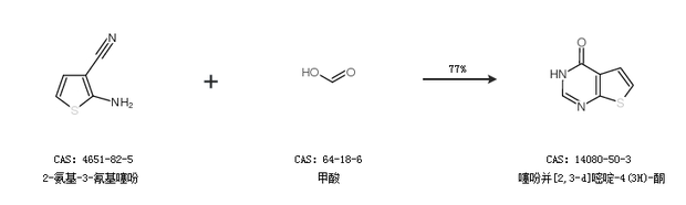 2.通過2-氨基-3-氰基噻吩和甲酸合成噻吩并[2,3-d]嘧啶-4(3H)-酮,收率約77%;