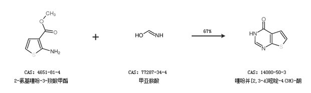 1.通過2-氨基噻吩-3-羧酸甲酯和甲亞胺酸合成噻吩并[2,3-d]嘧啶-4(3H)-酮,收率約67%;