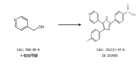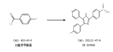 英文別名 4-(4-Fluorophenyl)-2-(4-methylsulfinylphenyl)-5-(4-pyridyl)-1H-imidazole;4-(4-Fluorophenyl)-2-(4-methylsulfinylphenyl)-5-(4-pyridyl)1H-imidazole;RWJ 64809;4-(4-Fluorophenyl)-2-(4-methylsulfinylphenyl)-5-(pyridin-4-yl)-1H-imidazole;PB 203580;Pyridine,4-(5-(4-fluorophenyl)-2-(4-(methylsulfinyl)phenyl)-1H-imidazol-4-yl);4-(4-Fluorophenyl)-2-(4-methylsulfinylphenyl)-5-(pyridin-4-yl)imidazole;4-(4-(4-Fluorophenyl)-2-(4-(methylsulfinyl)phenyl)-1H-imidazol-5-yl)pyridine;4-(4-(4-fluorophenyl)-2-(4-(methylsulfinyl)phenyl)-1H-imidazol-5-yl)pyridine;