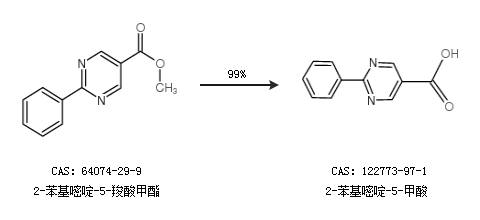 1.通過2-苯基嘧啶-5-羧酸甲酯合成2-苯基嘧啶-5-甲酸,收率約99%;