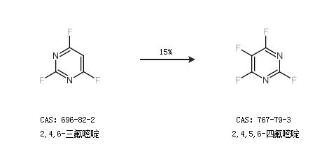 1.通過(guò)2,4,6-三氟嘧啶合成2,4,5,6-四氟嘧啶,收率約62%;