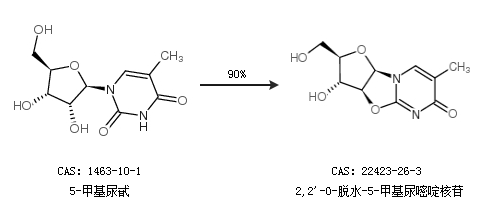 1.通過(guò)5-甲基尿甙合成2,2''-O-脫水-5-甲基尿嘧啶核苷,收率約90%;