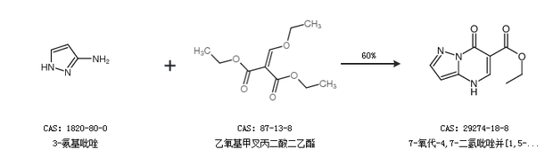 2.通過(guò)3-氨基吡唑和乙氧基甲叉丙二酸二乙酯合成7-氧代-4,7-二氫吡唑并[1,5-a]嘧啶-6-羧酸乙酯,收率約60%;