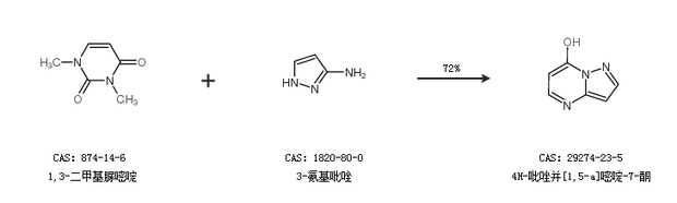 1.通過(guò)1,3-二甲基脲嘧啶和3-氨基吡唑合成4H-吡唑并[1,5-a]嘧啶-7-酮,收率約72%;