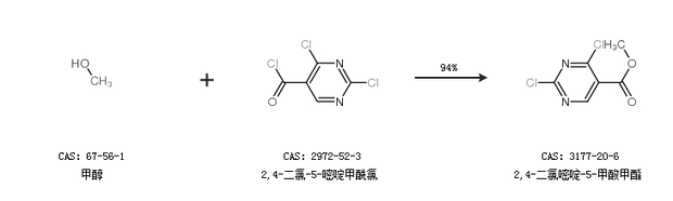 1.通過甲醇和2,4-二氯-5-嘧啶甲酰氯合成2,4-二氯嘧啶-5-甲酸甲酯,收率約94%;