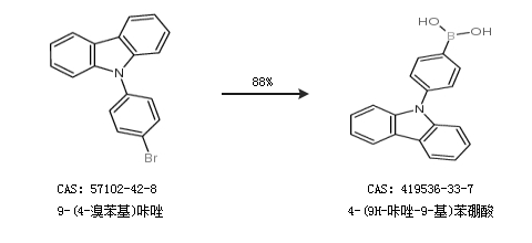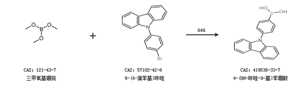 2.通過三甲氧基硼烷和9-(4-溴苯基)咔唑合成4-(9H-咔唑-9-基)苯硼酸,收率約84%;