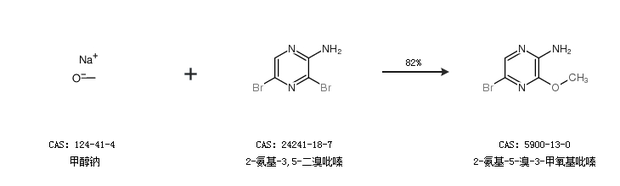 1.通過甲醇鈉和2-氨基-3,5-二溴吡嗪合成2-氨基-5-溴-3-甲氧基吡嗪,收率約82%;
