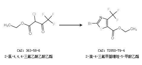 2.通過2-氯-4,4,4-三氟乙酰乙酸乙酯合成2-溴-4-三氟甲基噻唑-5-甲酸乙酯