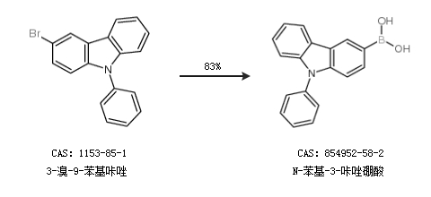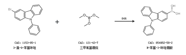 2.通過(guò)3-溴-9-苯基咔唑和三甲氧基硼烷合成N-苯基-3-咔唑硼酸,收率約84%;