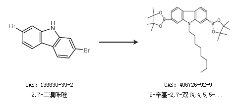1.通過(guò)溴辛烷合成9-辛基-2,7-雙(4,4,5,5-四甲基-1,3,2-二噁硼烷-2-基)-9h-咔唑