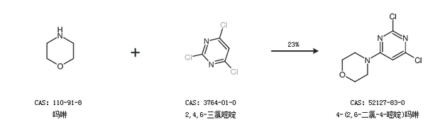 2.通過(guò)嗎啉和2,4,6-三氯嘧啶合成4-(2,6-二氯-4-嘧啶)嗎啉,收率約23%;