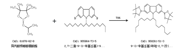 2.通過2,7-二溴-9-(1-辛基壬基)-9H-咔唑和聯(lián)硼酸頻那醇酯合成9-(1-辛基壬基)咔唑-2,7-雙(硼酸頻哪醇酯),收率約86%;