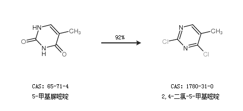 1.通過(guò)5-甲基脲嘧啶合成2,4-二氯-5-甲基嘧啶,收率約92%;