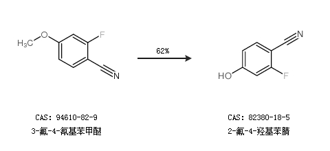 1.通過3-氟-4-氰基苯甲醚合成2-氟-4-羥基苯腈,收率約62%;