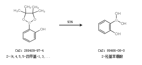 1.通過(guò)2-(4,4,5,5-四甲基-1,3,2-二雜氧戊硼烷-2-基)苯酚合成2-羥基苯硼酸,收率約93%;
