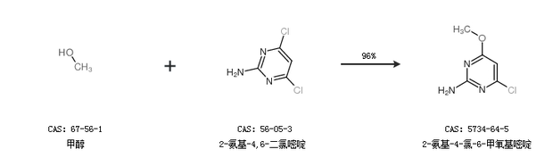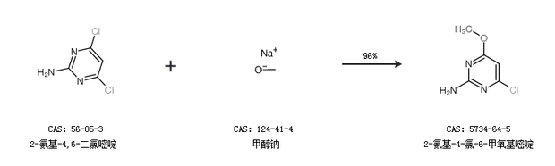 2.通過甲醇和2-氨基-4,6-二氯嘧啶合成2-氨基-4-氯-6-甲氧基嘧啶,收率約96%;