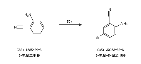2.通過(guò)2-氨基苯甲腈合成2-氨基-5-溴苯甲腈,收率約50%;