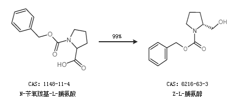 1.通過N-芐氧羰基-L-脯氨酸合成Z-L-脯氨醇,收率約99%;