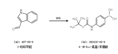 1.通過(guò)3-吲哚甲醛合成4-(N-Boc-氨基)苯硼酸,收率約98%;