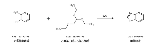 1.通過2-氨基苯硫醇和乙氧基乙醛二乙基乙縮醛合成苯并噻唑,收率約89%;