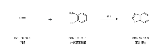 2.通過甲醛和2-氨基苯硫醇合成苯并噻唑,收率約97%;