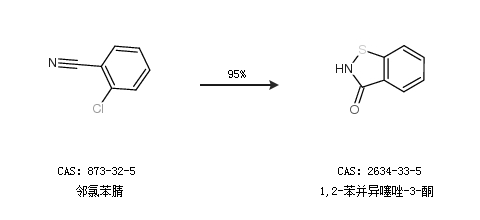 1.通過鄰氯苯腈合成1,2-苯并異噻唑-3-酮,收率約95%;